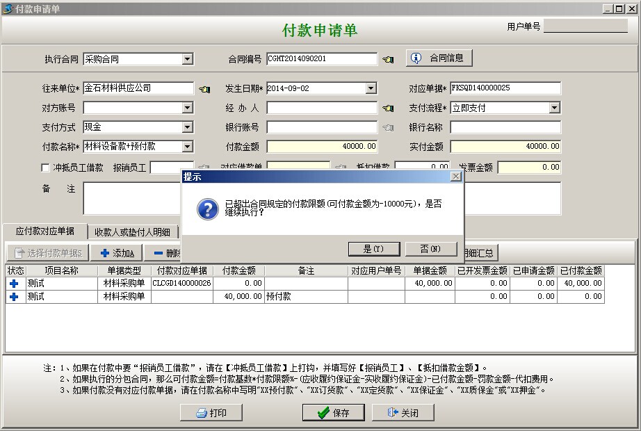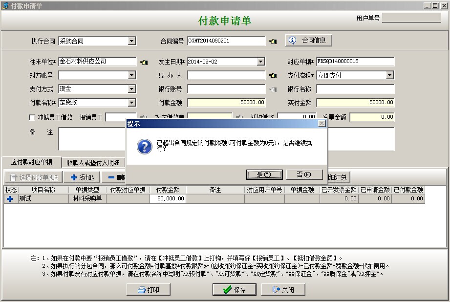 彈出付款申請單,付款名稱自動默認(rèn)材料設(shè)備款+預(yù)付款,付款明細(xì)是自動帶入的,選擇支付方式點(diǎn)保存,會出現(xiàn)提示窗口根據(jù)下面截圖進(jìn)行選擇繼續(xù)。