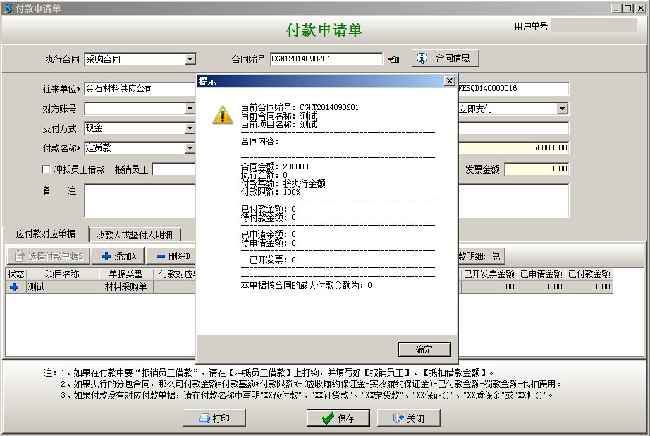 備注:上圖提示為預(yù)防超額付款的合同明細(xì)提示,點(diǎn)確定即可。