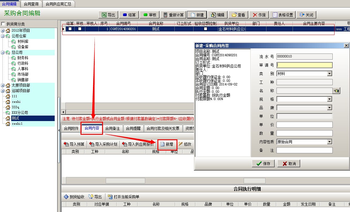 合同建立之后,點(diǎn)擊合同內(nèi)容,導(dǎo)入或是新增,錄入合同內(nèi)容。