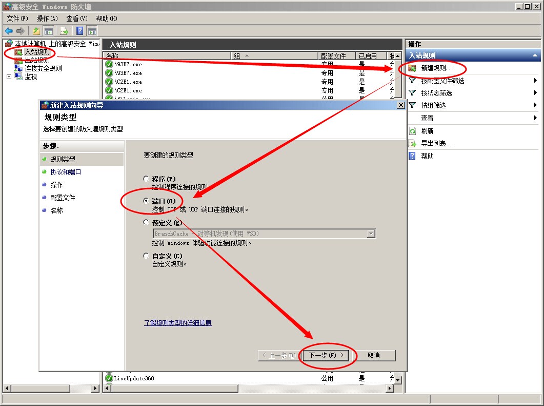 點入站規則----新建規則,在彈出的新建入站規則向導窗口中選端口項,點下一步