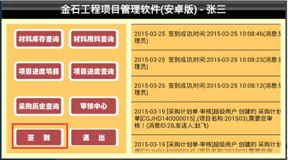 這樣用戶名為test的用戶登錄系統進入到“手機考勤管理終端”就可以查看并處理“東營市東營區”的手機考勤的信息。項目上的工作人員在用手機客戶端簽到的時候,登錄系統,點擊“簽到”的按鈕,簽到成功之后系統提示“簽到成功”并顯示簽到時間,如圖: