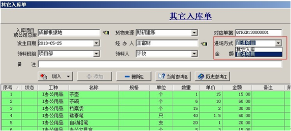 1. 【其他入庫單】一般用在期初庫存輸入或材料來源不牽扯應付賬款的情況。在填寫其他入庫單時進場方式選擇:直進項目,那么單據明細中材料的金額會直接進入單據所選擇的項目成本中。如果選擇了其他入庫,那么這批材料的金額不會直接反映到項目成本中,這批材料必須出庫后才會進入項目成本(這批材料的成本以出庫時所填寫單據中的金額為準)。