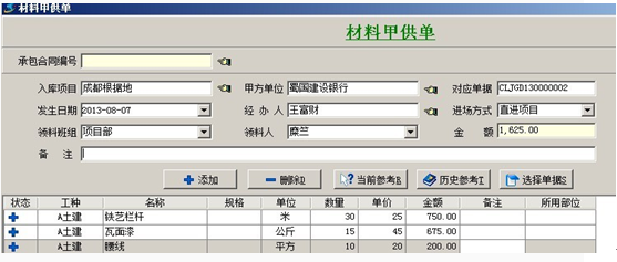 2. 【材料出庫單】在材料庫存單填寫的時候,在明細中選擇甲供,則該材料會進入項目甲供成本。