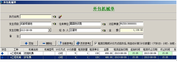 1. 【外包機械成本】一般用于統計工程中,租用的吊車、鏟車、挖機等大型機械設備所產生的成本。成本根據外包機械單來統計。