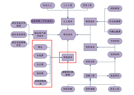 其他成本,是除人工、材料、機械之外的間接成本。例如:間接的人工費(管理人員的福利、養老保險等)、間接材料費(低值易耗品等)前期項目跟蹤費(招投標費等)、辦公費(項目部辦公用品等)、業務費、稅金等各種其他間接成本。