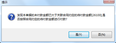 我們填寫的付款控制比例為20%,當(dāng)付款數(shù)超過(guò)付款比例限制時(shí),系統(tǒng)提醒。如下圖