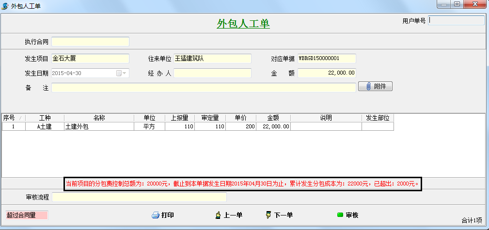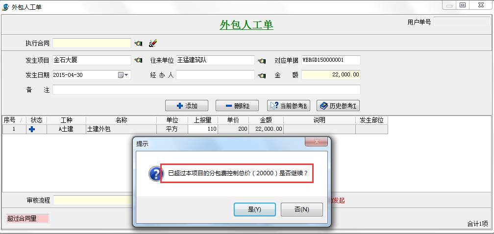 填入成本控制金額,當(dāng)超過(guò)該金額時(shí),系統(tǒng)會(huì)自動(dòng)提示。假如我們成本控制金額填入20000,我們?cè)谛落浫胪獍斯螘r(shí)會(huì)自動(dòng)提示。