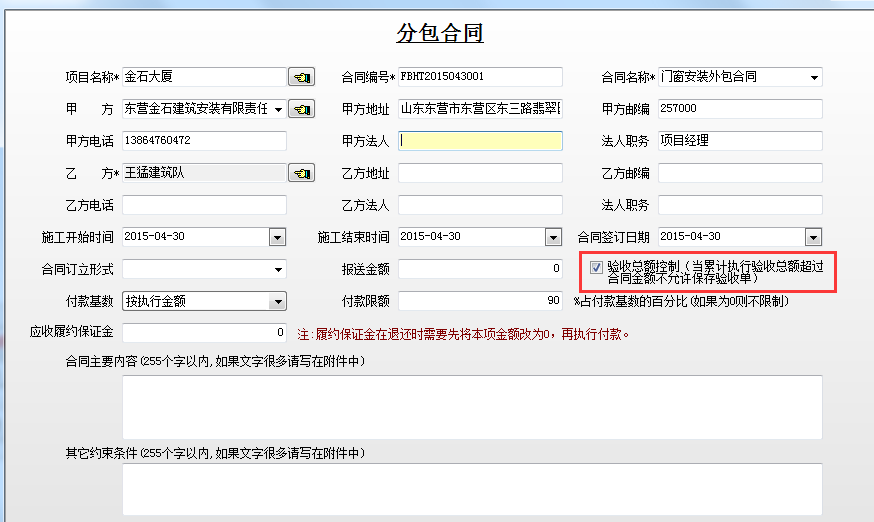 即通過(guò)分包合同驗(yàn)收總額控制選項(xiàng)來(lái)控制驗(yàn)收總額。