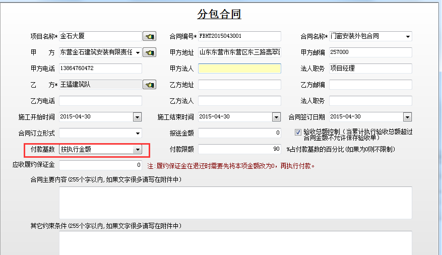 即在新建分包合同時(shí)填寫好付款限額。如下圖: