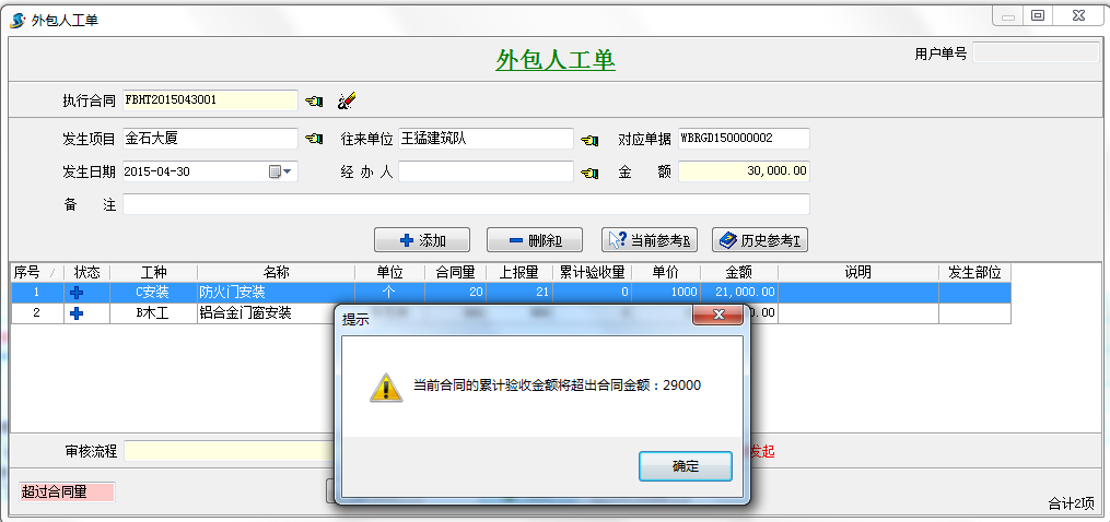 當(dāng)我們驗(yàn)收超過(guò)總額時(shí)系統(tǒng)會(huì)自動(dòng)提示,并且外包人工單不能保存。