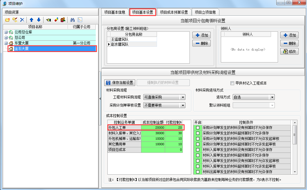 在新建項(xiàng)目時(shí)設(shè)置成本控制金額和付款控制比例。具體設(shè)置方法【工程管理】模塊?【項(xiàng)目維護(hù)】項(xiàng)目