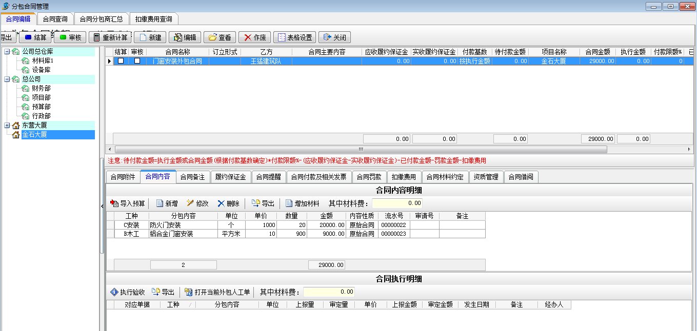 我們建立一個(gè)總價(jià)為29000的分包合同,付款基數(shù)按執(zhí)行金額,付款限額為90%。如下圖