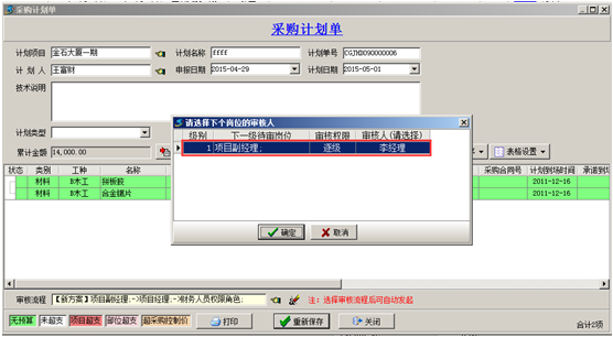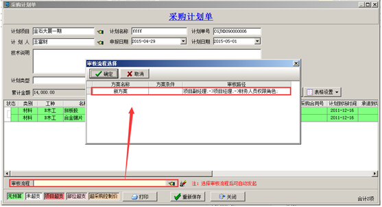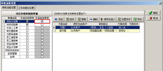 崗位角色以及用戶添加完成之后分別授權給相應的用戶(數量或者單價),或設置審核時可修改,設置完成之后點擊“保存”的按鈕,審核方案設置完成之后則授權發起人(按人名或者按崗位),在授權用戶的復選框內打勾即可,如果授權給“公共用戶”則在“公共用戶”的復選框內打鉤,被授權的用戶可在創建單據的時候選擇多級審核方案,如圖: