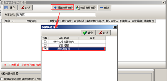 多級審核的單據,在“開啟多級審核”的復選框內打鉤,點擊“添加”的按鈕添加審核流程,依次添加待審崗位以及審核人,如圖: