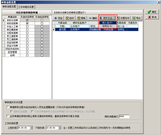 1、先由系統管理員設置好每個審核方案的每個審核級別的審核周期(如1天,2天,1個工作日,2個工作日等)、并設置好每天的上班時間 和下班時間。如早8:00 到下午18:00。