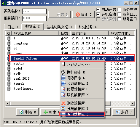 Sql2000數據備份時,在電腦的右下角點擊迷你sql的圖標彈出迷你SQL2000的對話框,選中要備份的數據庫名稱。點擊鼠標右鍵選在“備份數據庫”,彈出“另存為”的對話框,選擇備份文件保存的地址,輸入備份文件的名字,然后點擊“保存”的按鈕,如圖: