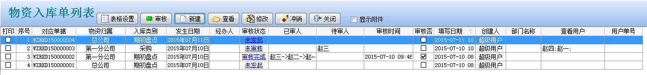 【物資入庫單】是用來登記發生的物資入庫的單據。