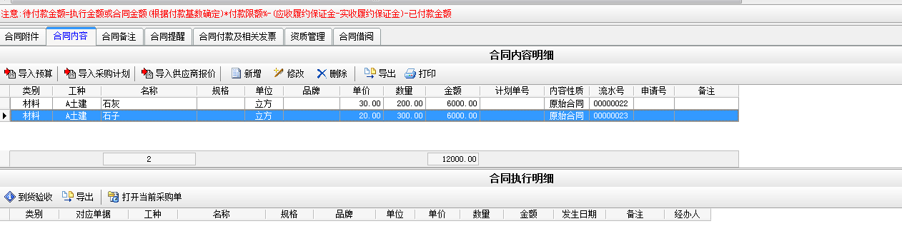 例如我們做一個采購石灰和石子的采購合同,合同總價為12000。如下圖;