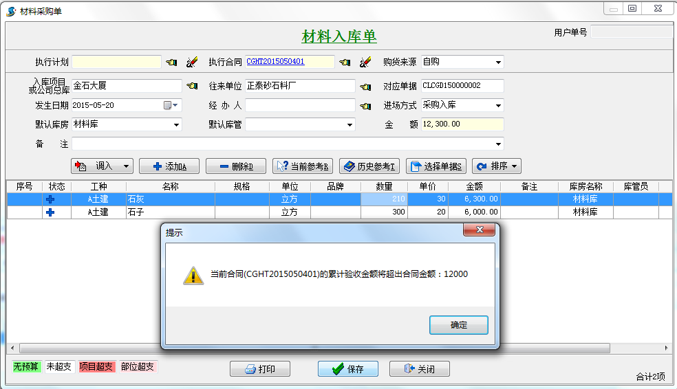 在工程項目管理系統(tǒng)中當(dāng)我們驗收金額超過總額時系統(tǒng)會自動提示,并且材料采購單不能保存。如下圖
