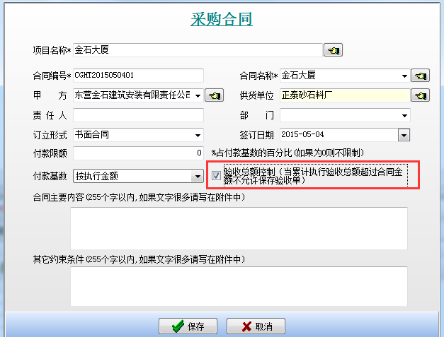 在工程管理軟件中即通過采購合同驗收總額控制選項來控制驗收總額。