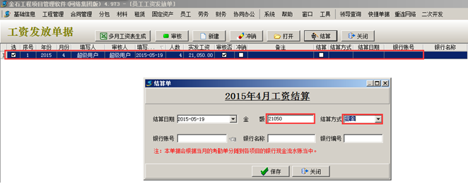 工程管理軟件中結算時,選中審核通過的“員工工資表”,點擊“結算”的按鈕,可選擇“分人結算”或“整單結算”。