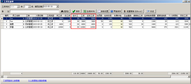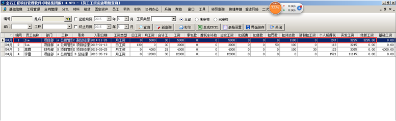 工程管理軟件工資表生成之后員工在不同項目上出勤的工資會生成到同一張工資表中,如圖: