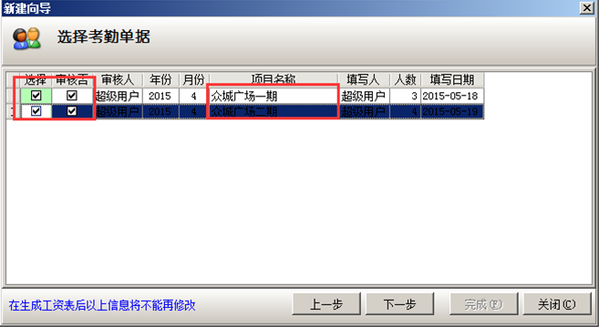 在做員工工資表時,選擇生成四月份工資表,并同時選擇“眾城廣場一期”和“眾城廣場二期”的考勤單據。