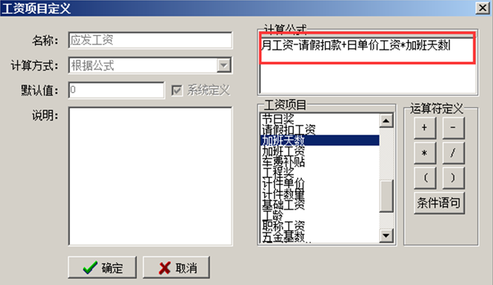 若員工加班計入工資,則定義加班金額并帶入計算公式。如圖所示: