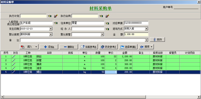 工程管理軟件中采購(gòu)原材料到庫(kù)房做材料采購(gòu)單,入庫(kù)庫(kù)房選擇生產(chǎn)車間的庫(kù)房。如圖: