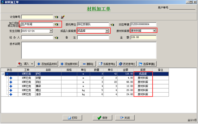 注:(1)在材料加工單的材料列表中對(duì)應(yīng)好各材料所在的庫(kù)房。否則系統(tǒng)會(huì)默認(rèn)為默認(rèn)的“成品入庫(kù)庫(kù)房”或“原材料庫(kù)房”。