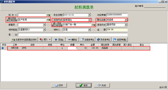 項(xiàng)目上使用產(chǎn)成品時(shí),需要從“生產(chǎn)車間”將產(chǎn)品調(diào)撥到項(xiàng)目上,在工程管理軟件中做“材料調(diào)撥單”,填寫調(diào)撥單時(shí),調(diào)出項(xiàng)目要選擇“生產(chǎn)車間”,出廠方式選擇“庫(kù)房調(diào)出”,并選擇對(duì)應(yīng)的庫(kù)房,選擇對(duì)應(yīng)的調(diào)入項(xiàng)目以及“領(lǐng)料班組”和“領(lǐng)料人”。如圖: