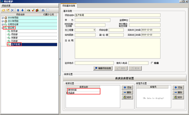 首先在金石工程管理軟件“工程管理”的“項(xiàng)目維護(hù)”中,在公司節(jié)點(diǎn)下建立“生產(chǎn)車間”并設(shè)立對(duì)應(yīng)庫(kù)房,這樣便于對(duì)用于生產(chǎn)的原材料或者產(chǎn)品進(jìn)行管理。如圖: