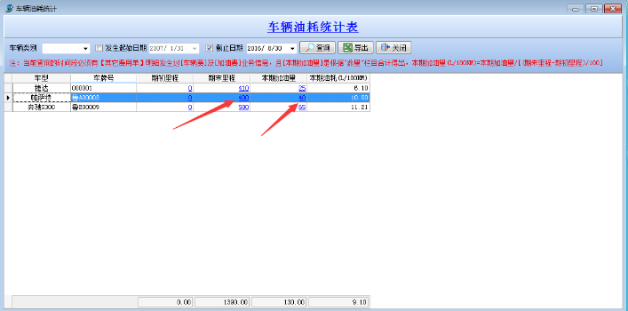 注:當(dāng)前查詢的時(shí)間段必須有【其他費(fèi)用單】明細(xì)發(fā)生過[車輛]及[加油費(fèi)]業(yè)務(wù)信息,且[本期加油量]是根據(jù)“數(shù)量”欄目合計(jì)得出,本期加油量(L/100KM)=本期加油量/[(期末里程—期初里程)/100]