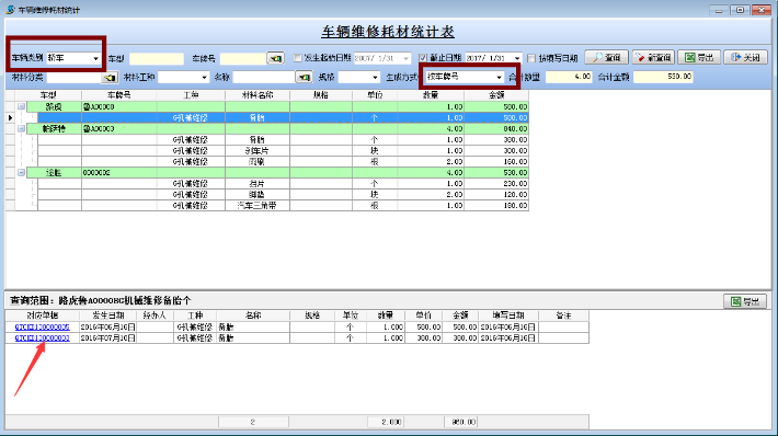 【材料管理】→【其它出庫單】,出庫類別→車輛維修→車牌號(hào)