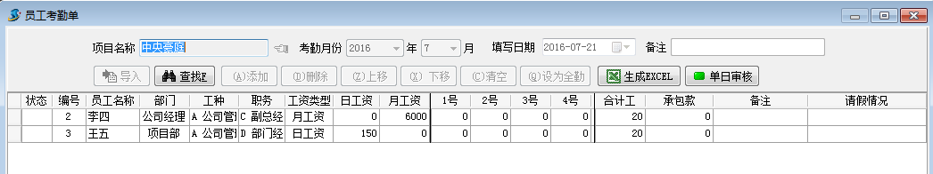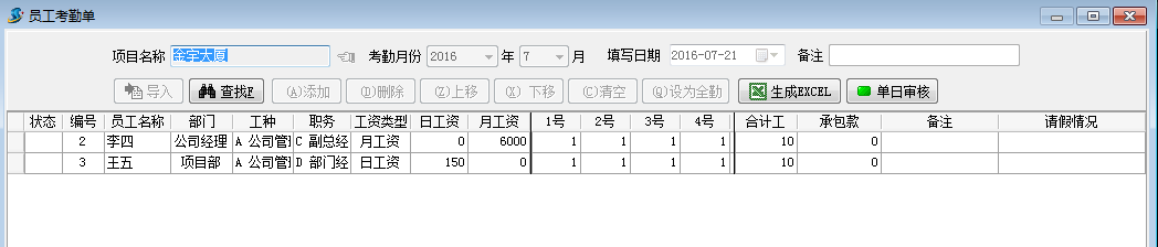 3. 在工程項目管理系統建立員工考勤單。我們以李四和王五在金宇大廈項目分別出勤10天,在中央豪庭項目分別出勤20天為例,建立考勤單為例。如下圖: