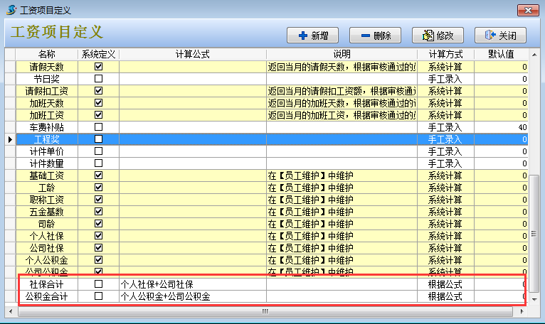 2. 然后在工程項目管理系統【員工管理】-【工資項目定義】設定好實發工資的公式和新增社保合計,公積金合計兩個工資科目。其中實發工資公式中要減去個人社保和個人公積金。如下圖: