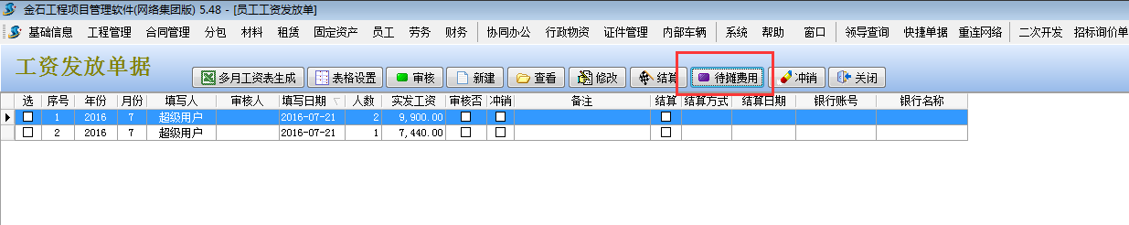 工資表保存后,選擇工程項目管理系統【待攤費用】模塊。如下圖: