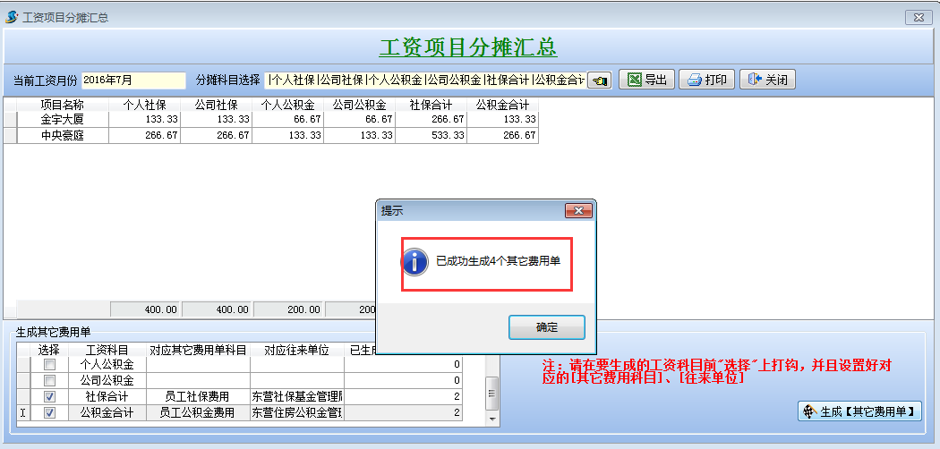 打開待攤費用模塊,選擇好分攤科目,列表中就會顯示出每個項目分攤客戶的明細。同時在這個模塊可以直接生成其它費用單,選擇好社保合計和公積金合計的對應其它費用單科目和對應往來單位,點擊生成工程項目管理系統【其它費用單】,直接可以生成四張其他費用單。