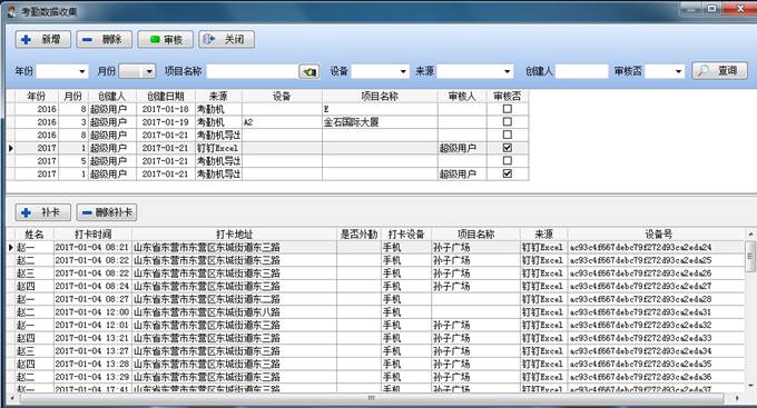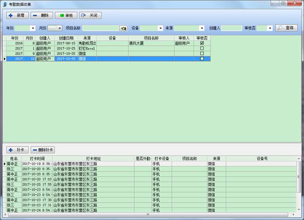 在考勤設(shè)備讀取操作界面也有相應(yīng)的查詢篩選項(xiàng),可以通過(guò)年份、月份、項(xiàng)目名稱、設(shè)備、來(lái)源、創(chuàng)建人、審核否等相關(guān)信息來(lái)篩選查詢從考勤設(shè)備讀取的信息。