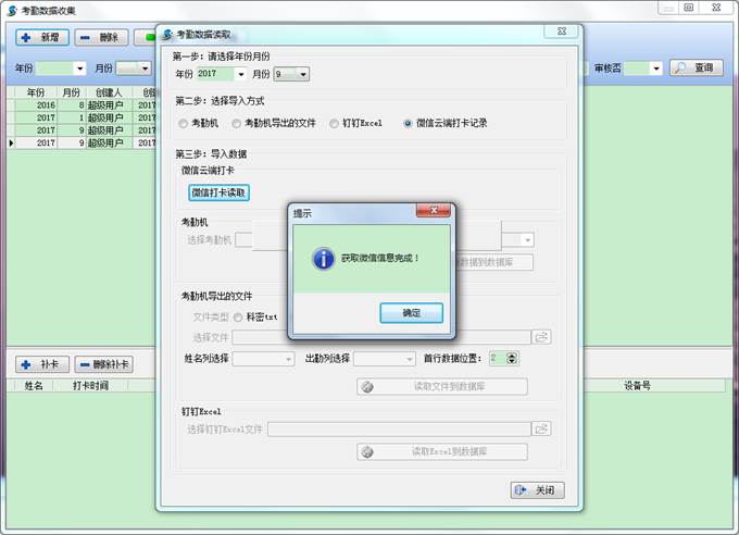 選擇微信云端打卡記錄,點(diǎn)擊微信打卡讀取,等待獲取,獲取結(jié)束后,提示完成,如下圖,