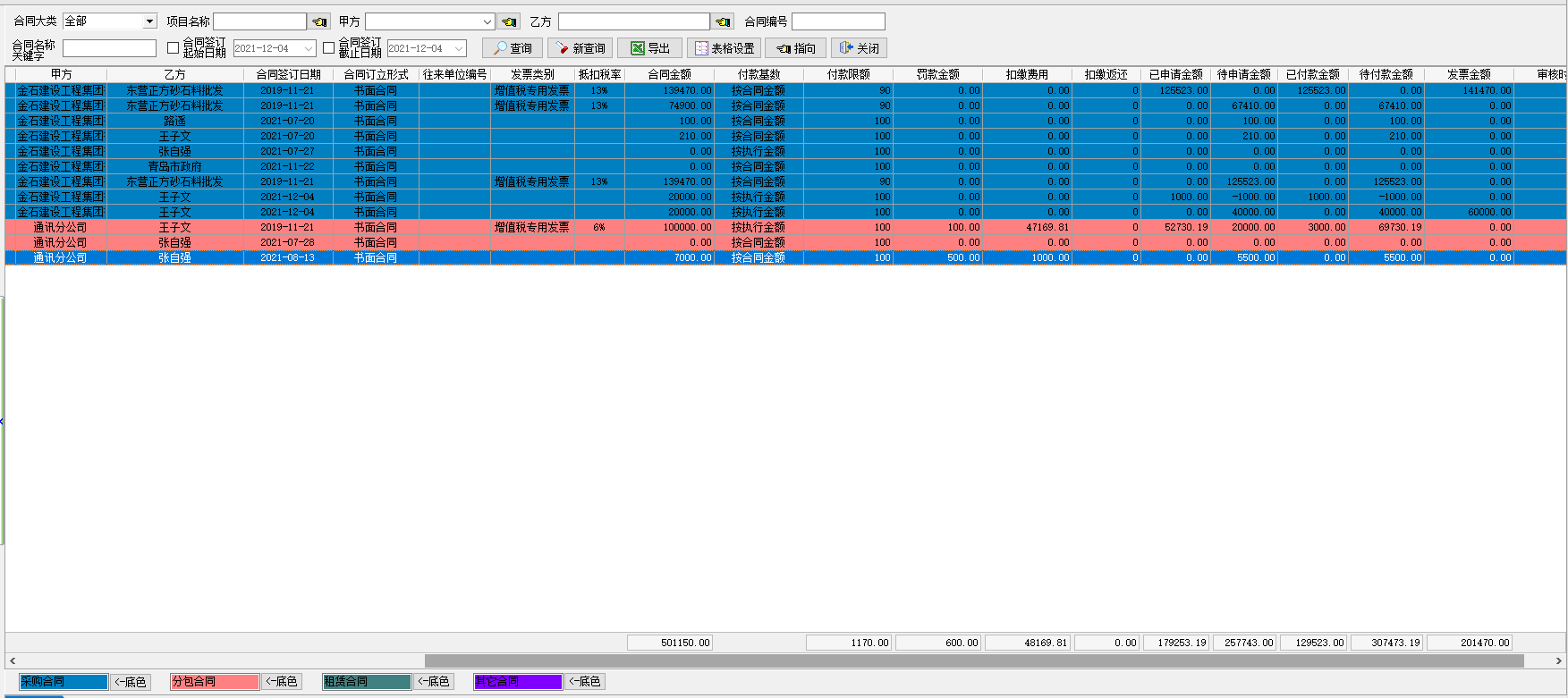 查詢內(nèi)容包括:合同基礎(chǔ)信息(時間、甲乙方)、發(fā)票信息(類別、稅率)、金錢往來(付款、罰款、扣繳、已付款、未付款等信息)