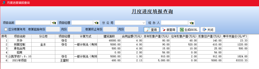 月度進度填報單可以實現按月上報形象產值進度并自動統計當年度產值,總產值以及單平米造價。可以可以根據上報的產值計算待收款以及利潤。