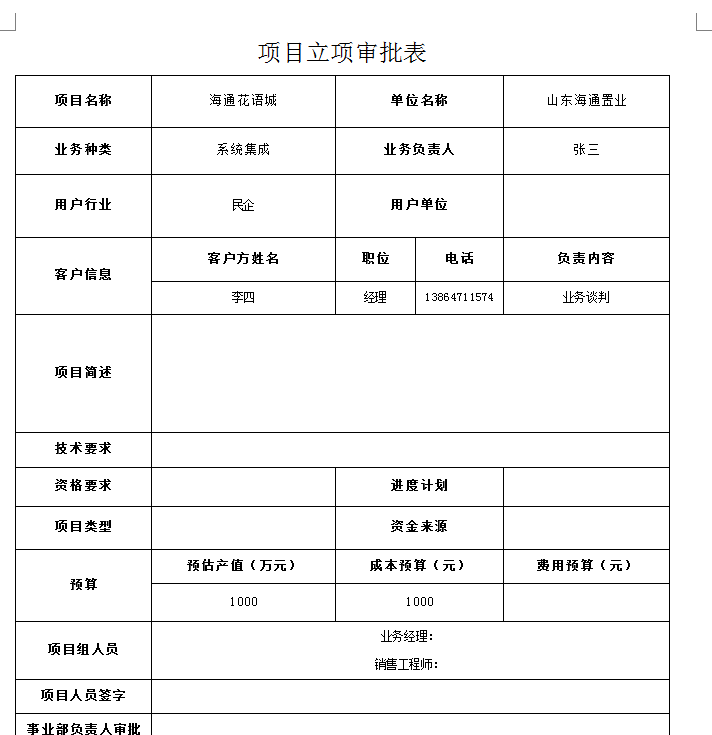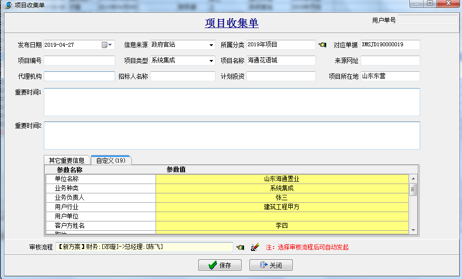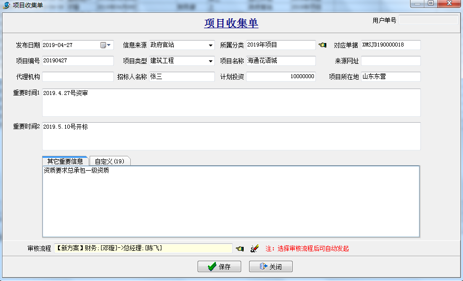 項目收集單:主要是用于項目投標前的收集,公司銷售人員將在“政府網(wǎng)站” 、“自己開拓”等項目前期信息歸檔并走相應的公司內(nèi)審批流程,確定哪些項目我們可以去參與投標。