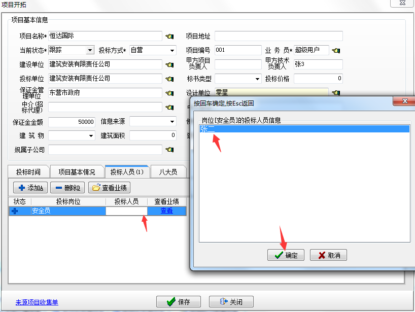 錄入好姓名后,選擇相對應(yīng)的崗位(選擇崗位時,可以一人設(shè)多崗),依次添加好投標人員后,關(guān)閉該窗口,如下圖: