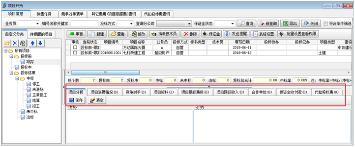 2. 填寫項(xiàng)目開(kāi)拓的相關(guān)信息記錄(項(xiàng)目分析、項(xiàng)目進(jìn)展情況、競(jìng)爭(zhēng)對(duì)手、項(xiàng)目資料、項(xiàng)目跟蹤費(fèi)用、項(xiàng)目跟蹤收入、項(xiàng)目合作單位、保證金,代扣投標(biāo)費(fèi)等)。