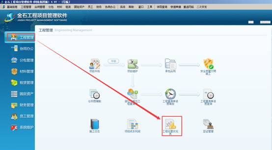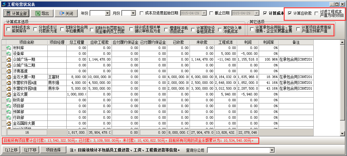 “工程經營狀況表”用來查詢公司經營狀況,進入“工程管理”的模塊,點擊“工程經營狀況表”,查看所有工程項目的經營狀況,可選擇計算成本的選項,如圖: