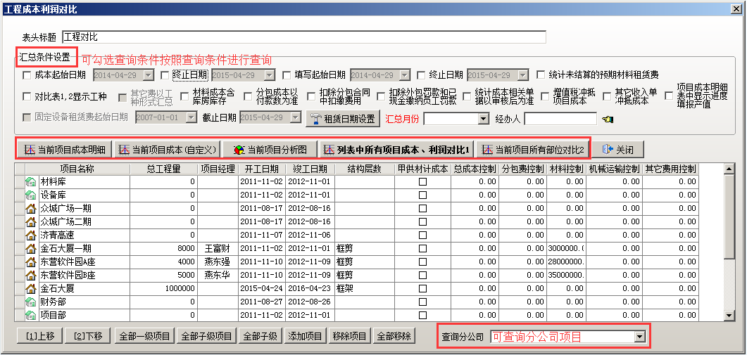 查看項目與項目之間的成本利潤對比,輸入查詢條件,點擊“列表中所有項目成本利潤對比1”,如圖