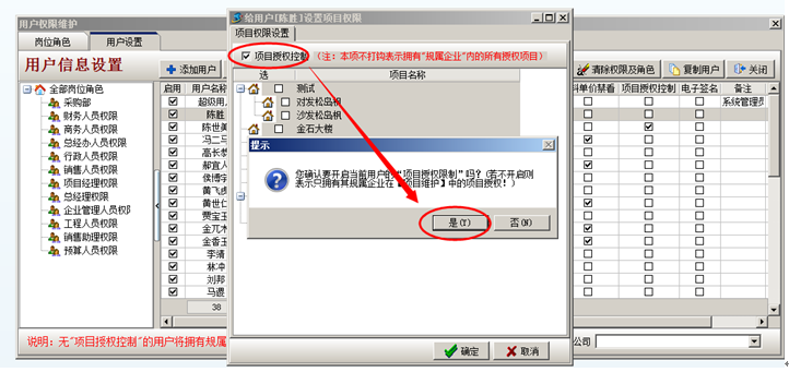 彈出設置項目授權,以陳勝只有金石大樓這個項目的權限進行項目授權