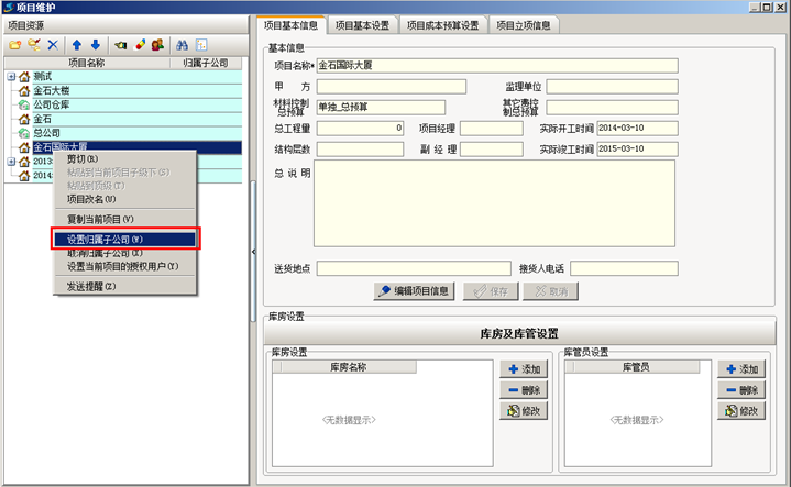 選擇項目右鍵單擊,點設置歸屬子公司,