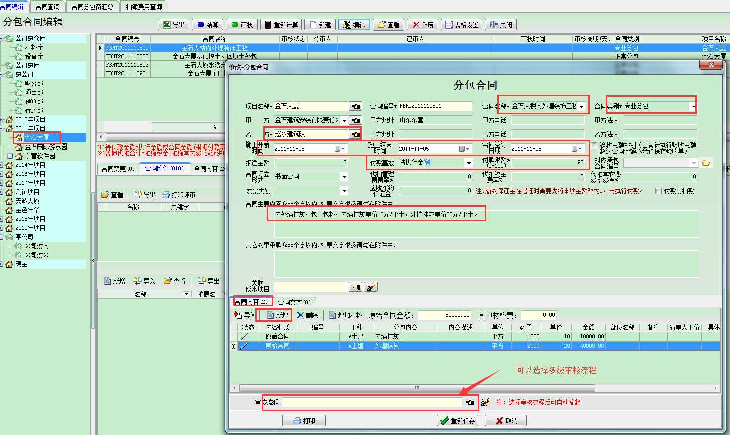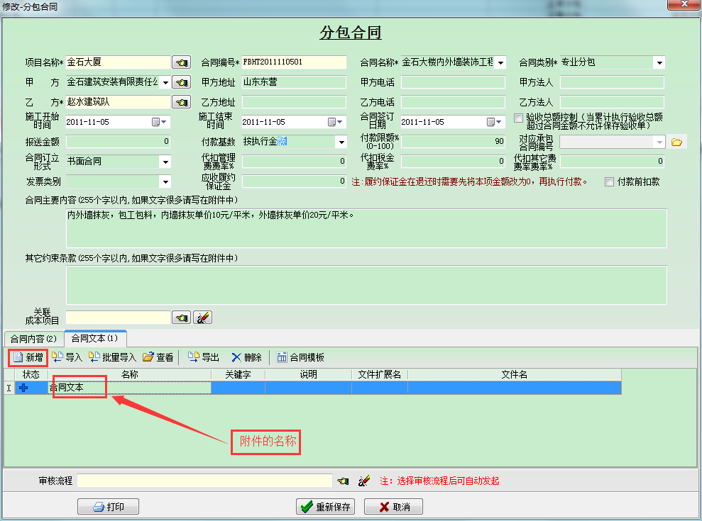 選中[金石大廈]項目點(diǎn)擊【新建】來建立一個合同,界面如下: